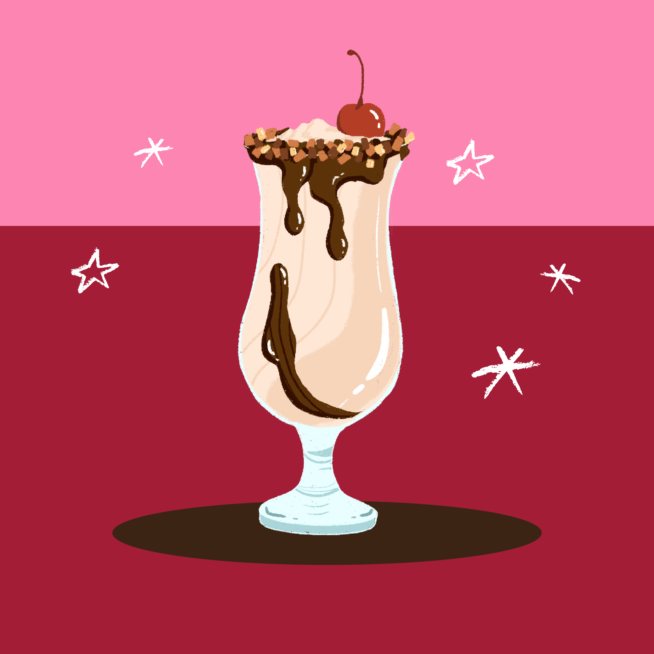 Garnish a Hurricane glass with crushed Almond Roca rim & chocolate drizzle pour in cocktail & top with Maraschino cherry.